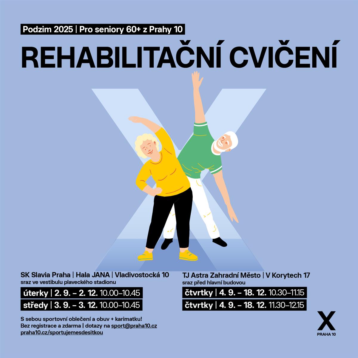Rehabilitační cvičení pro seniory má za cíl zmírnit či odstranit zdravotní potíže spojené se seniorským věkem. Cvičení je zaměřeno na správné držení těla, protahuje, uvolňuje a zapojuje střed těla. Vyzkoušíte si všestranné cvičení s prvky pilates a jógy. S sebou si nezapomeňte sportovní oblečení, obuv a karimatku.