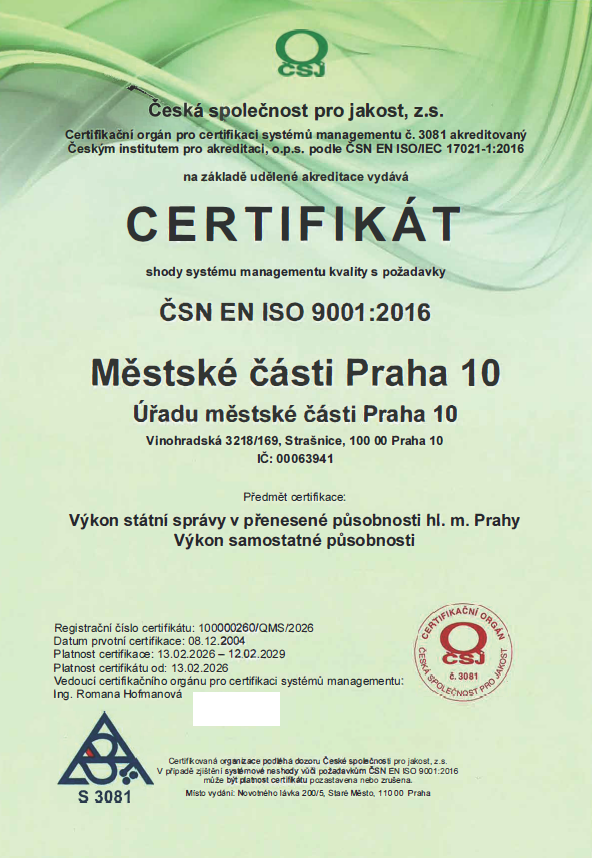 Úřad městské části Praha 10 úspěšně obhájil certifikát shody systému managementu kvality s požadavky normy ČSN EN ISO 9001:2016. Tento certifikát, který úřad vlastní již od roku 2004, potvrzuje kvalitu a efektivitu výkonu státní správy v přenesené působnosti hl. m. Prahy a výkon samostatné působnosti.