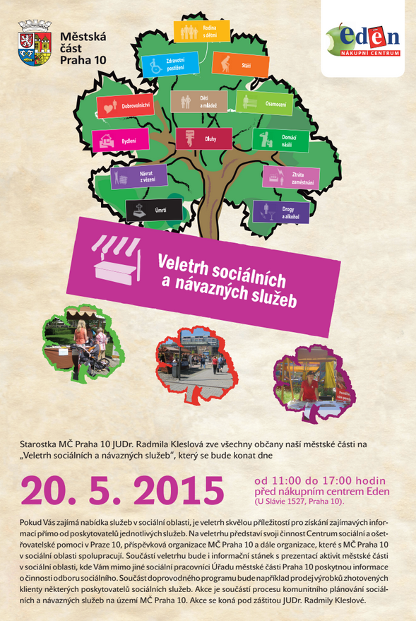 Dne 20. 5. 2015 od 11:00 do 17:00 hodin pořádá MČ Praha 10 již čtvrtý ročník Veletrhu sociálních a návazných služeb před nákupním centrem Eden (U Slávie 1527, Praha 10).