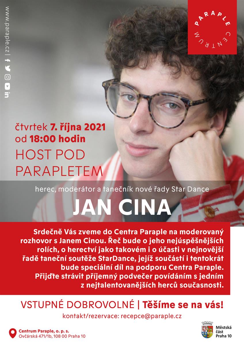 Jana Cinu k herectví přemluvili rodiče. Dobře udělali. Po dvou nominacích na Českého lva, vítězství v soutěži Tvoje tvář má známý hlas i po mnoha úspěšných rolích není pochyb, že talent našeho hosta je veliký. Budeme mluvit nejen o herectví jako takovém, ale také o blížící se účasti v taneční soutěži StarDance, jejíž součástí bude tradiční speciální díl věnovaný podpoře Centra Paraple. Rozmanité role Jana Ciny, od čerta Bonifáce po ztvárnění dramatické postavy Standy Láníka v seriálu Herec, dlouhodobě oslovují diváky napříč generacemi. Jsme přesvědčeni, že ne jinak tomu bude i 7. 10. 2021 v Centru Paraple. Zeptejte se, co vás zajímá. Rozhovor povede moderátor Václav Uher. Těšíme se na vás! Vstupné je dobrovolné. Kontakt/rezervace: recepce@paraple.cz.
