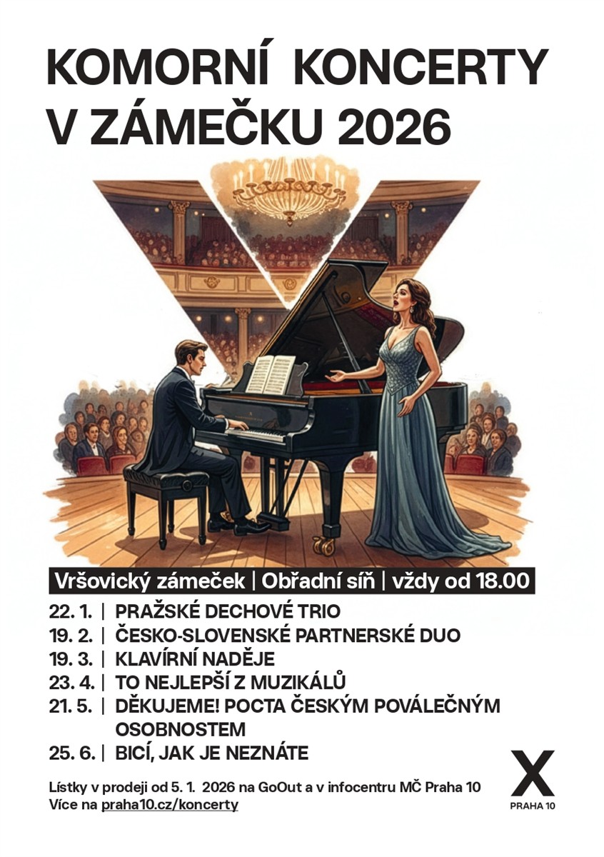 Tradiční komorní koncerty pořádané MČ Praha 10 ve Vršovickém zámečku, v obřadní síni. Koncerty začínají vždy v 18.00 hod. a do sálu se pouští od 17.30 hod.