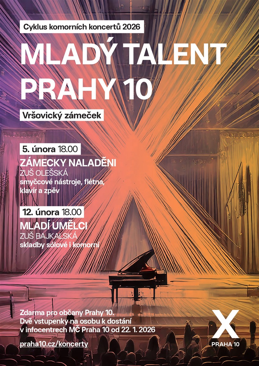 Akce Mladý talent Prahy 10 je zcela zdarma pro obyvatele Prahy 10. Dvě vstupenky na osobu si můžete vyzvednout na infocentru MČ Praha 10 od 22. ledna 2026.