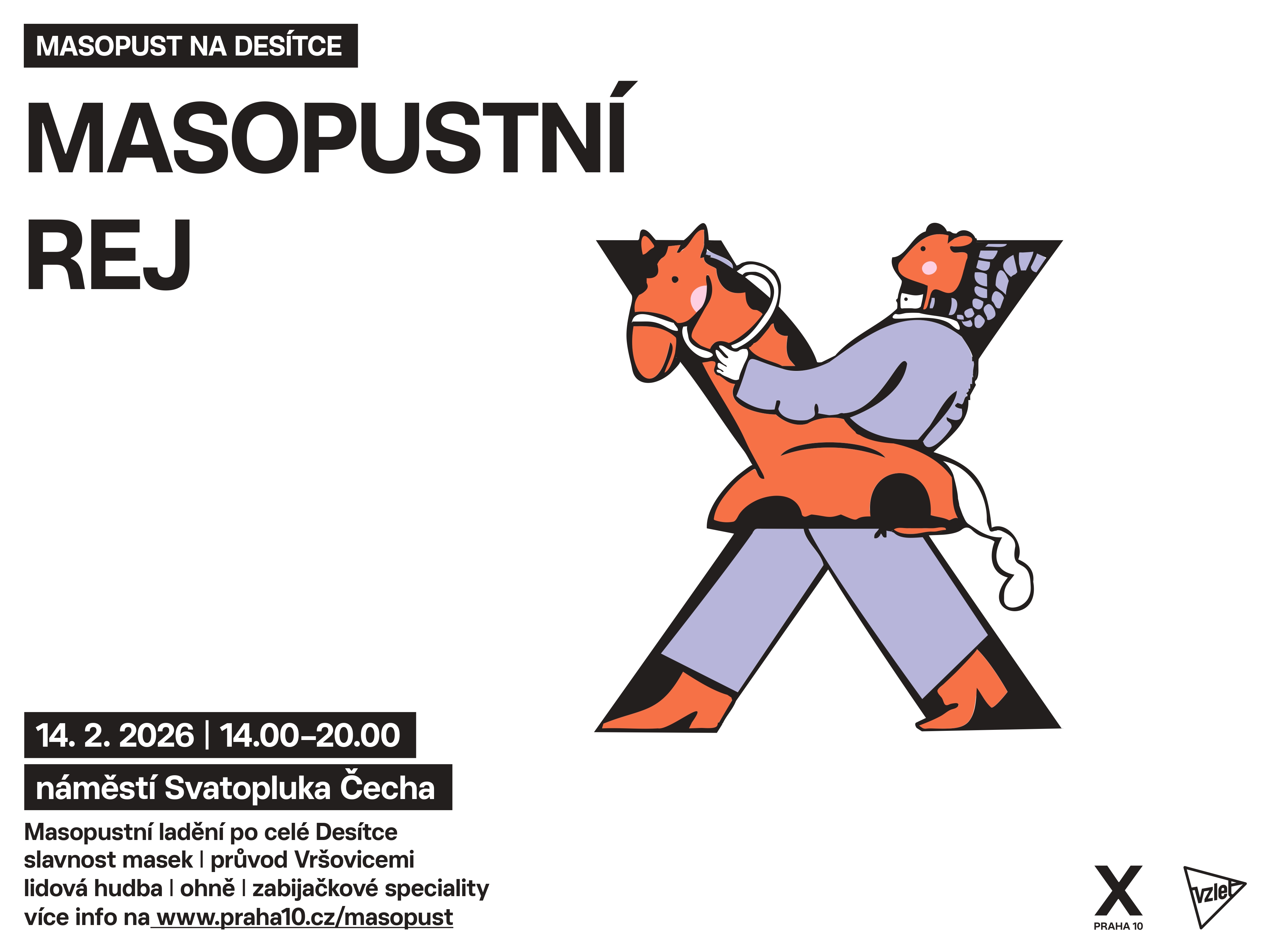 Náš průvod zahájíme 14. února 2026 na náměstí Svatopluka Čecha, kde se budete moct i občerstvit. O pravou masopustní atmosféru se postará živá hudba a maškary, se kterými pak vyrazíme průvodem přes Vršovice, kolem Vzletu a zpět na Čechovo náměstí, kde průvod zakončíme zapálením ohňů, neřízenou veselicí a hodováním.