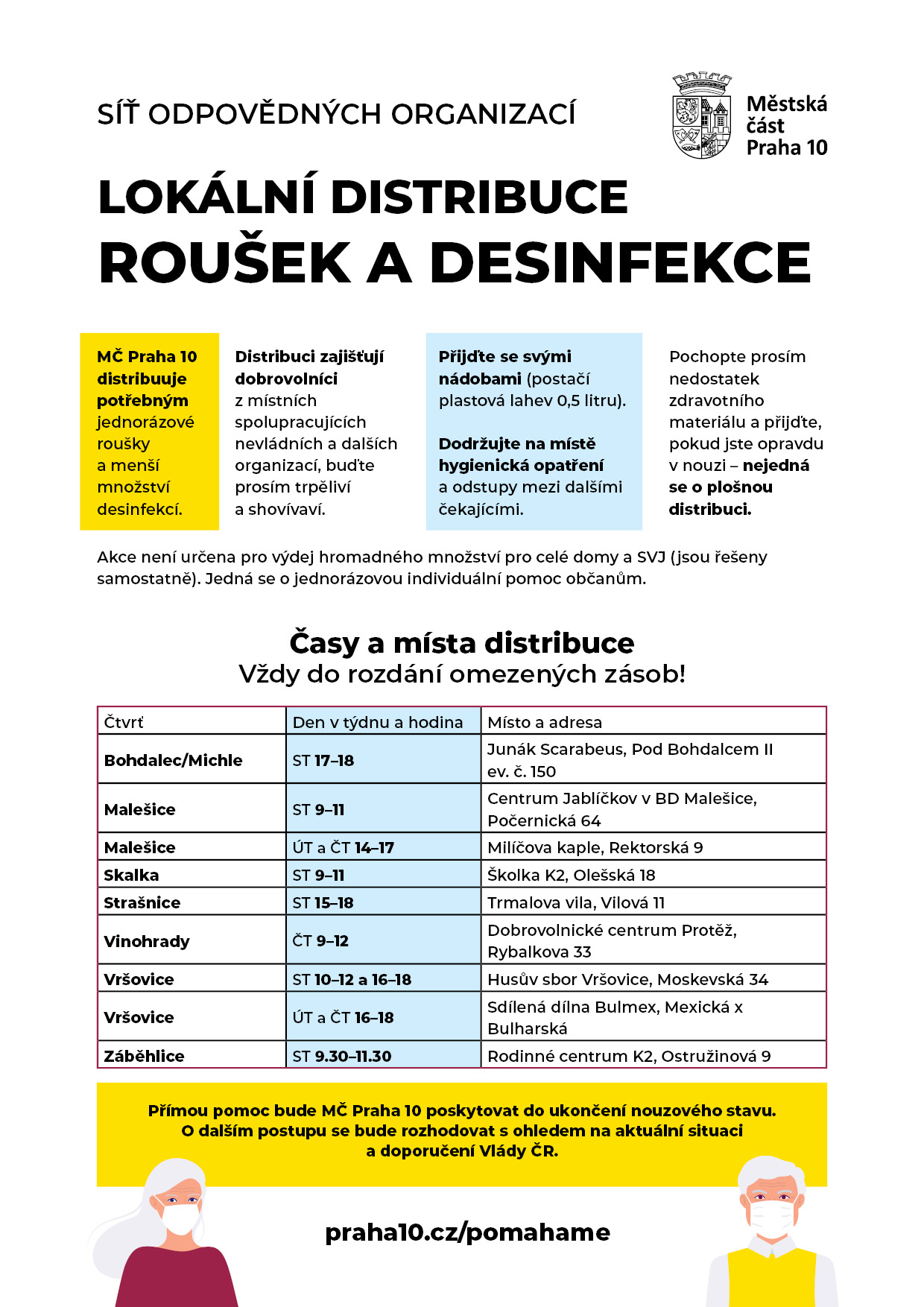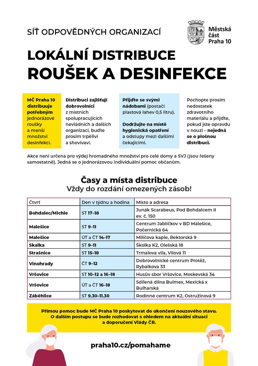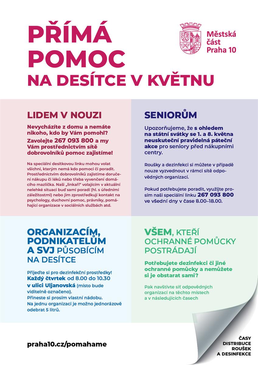 Praha 10 pokračuje s poskytováním pomoci také v tomto měsíci, a to až do ukončení nouzového stavu. V provozu zůstává Linka v nouzi a lokální distribuce roušek a dezinfekce potřebným.
