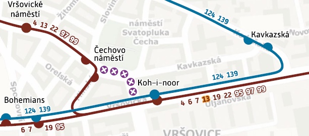 - Linky číslo 4, 22, 97 a 99 jsou v oblasti Čechova náměstí vedeny ve směru z centra přes přemístěnou zastávku Čechovo náměstí a ve směru do centra přes zastávku Čechovo náměstí v Minské ulici.