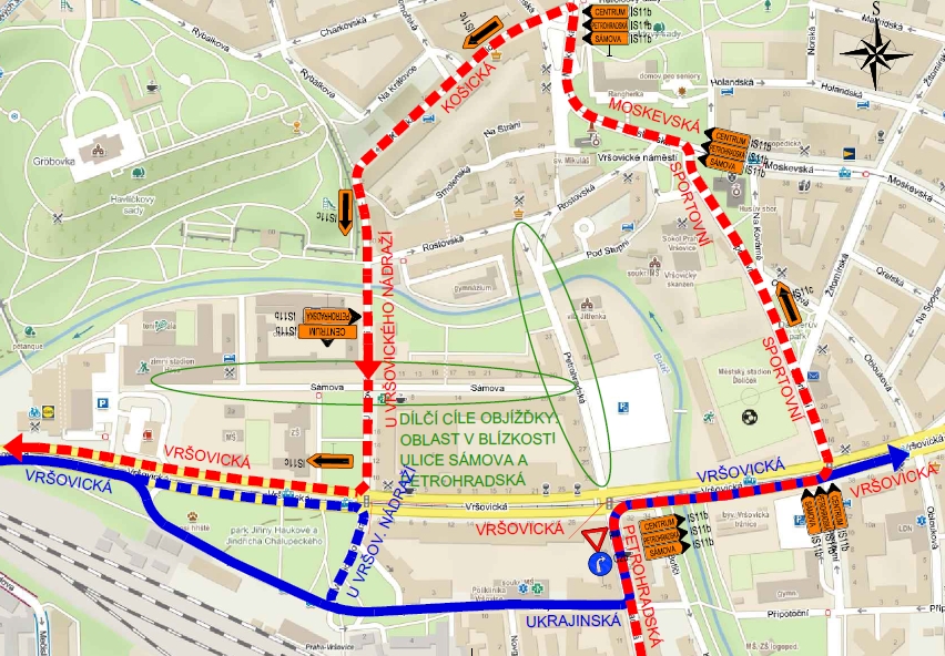 Provoz bude veden ulicí Ukrajinská, kde bude obrácena jednosměrnost a zakázáno zastavení na jižní straně vozovky. Zároveň bude umožněno pouze pravé odbočení z jižního ramene Petrohradské do Vršovické tak, aby provoz na objízdné trase byl co nejplynulejší (viz situace v příloze). Provoz BUS MHD (linky č. 124, 139 a 193) nebude omezen.