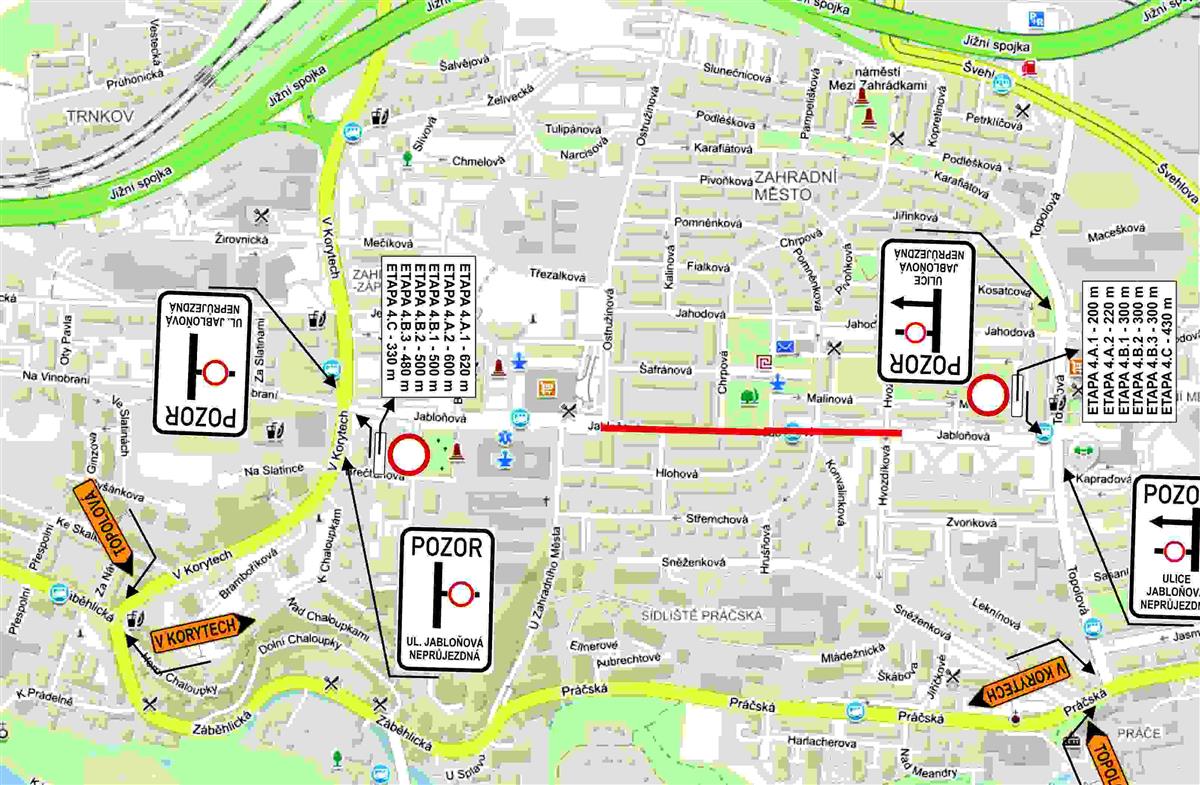 Akce bude rozdělena do tří podetap A, B a C v úsecích: Hvozdíková – Střemchová od 3.7. do 31.7. (viz situace 4.A.1), Střemchová – Chrpová od 1.8. do 31.8. (viz situace 4.B.1) a Chrpová – Ostružinová od 1.9. do 15.10.2019 (viz situace 4.C). V rámci podetap 4.A a 4.B bude v termínech dle reálného postupu prací docházet k překopům v místě křižovatek s kolmými ulicemi, kdy tyto křižovatky budou po nezbytnou dobu neprůjezdné (viz situace 4.A.2, 4.B.2, 4.B.3).