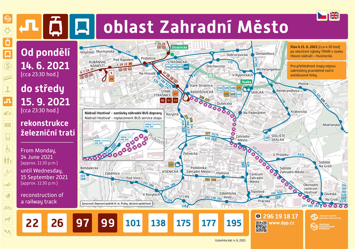 Tramvaje nebudou v provozu v úseku mezi obratištěm Radošovická a obratištěm Nádraží Hostivař, kde navíc proběhne rekonstrukce opěrných zdí. V úseku Strašnická – Nádraží Hostivař bude zavedena náhradní linka X26/X97. Pro individuální automobilovou dopravu a autobusy MHD (náhradní i pravidelnou dopravu) bude zřízena objízdná trasa po komunikacích Jižní spojka, V korytech, Průběžná.