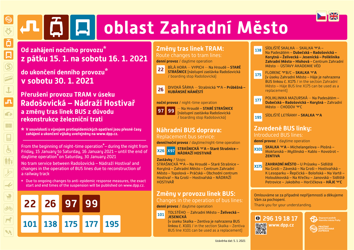 Objízdné trasy viz přiložená mapa nebo na https://opravujeme.to/action/233/. Úpravy MHD viz infografika nebo na https://www.dpp.cz/omezeni-a-mimoradne-udalosti/detail/8193.