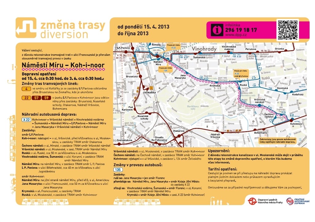 Po celou dobu rekonstrukce se počítá se zachováním jednoho jízdního pruhu pro nezbytnou dopravní obsluhu. Výjimku tvoří úsek mezi ulicemi Ruská – ul. Heroldovy sady (tzv. „soutěska“), kde z prostorových důvodů nebude v první fázi průjezd možný. Francouzská ulice zůstane pro silniční dopravu průjezdná ve směru od náměstí Míru do Vršovic. Ve směru do centra bude automobilová doprava vedena náhradní objízdnou trasou. O dalších podrobnostech Vás budeme informovat.