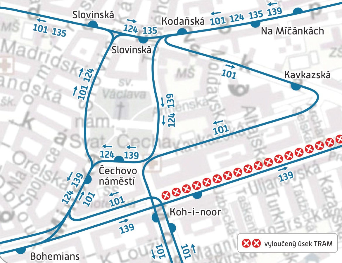 4) Dočasná změna trasy a zastávek linek 101, 124 a 139 v oblasti křižovatky Vršovická x Kodaňská