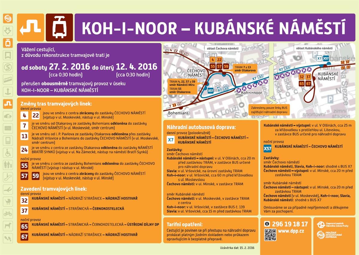ad 6) Linky 139, X7 a X57 - platnost: od zahájení nočního provozu dne 26.2./27.2.2016 (pátek/sobota) do ukončení denního provozu dne 11.4.2016 (pondělí); Linky 101 a 124 - platnost: od zahájení denního provozu dne 11.3.2016 (pátek) do ukončení denního provozu dne 11.4.2016 (pondělí); zastávka - přemisťuje se: Koh-i-noor: směr Kavkazská, resp, Slavia, resp. Bělocerkevská: v ul. Vršovické o 40 m po směru jízdy, cca 100 m za křižovatku s ul. Moskevskou, 11 m před sloup VO č. 001456 (sloup na TT)