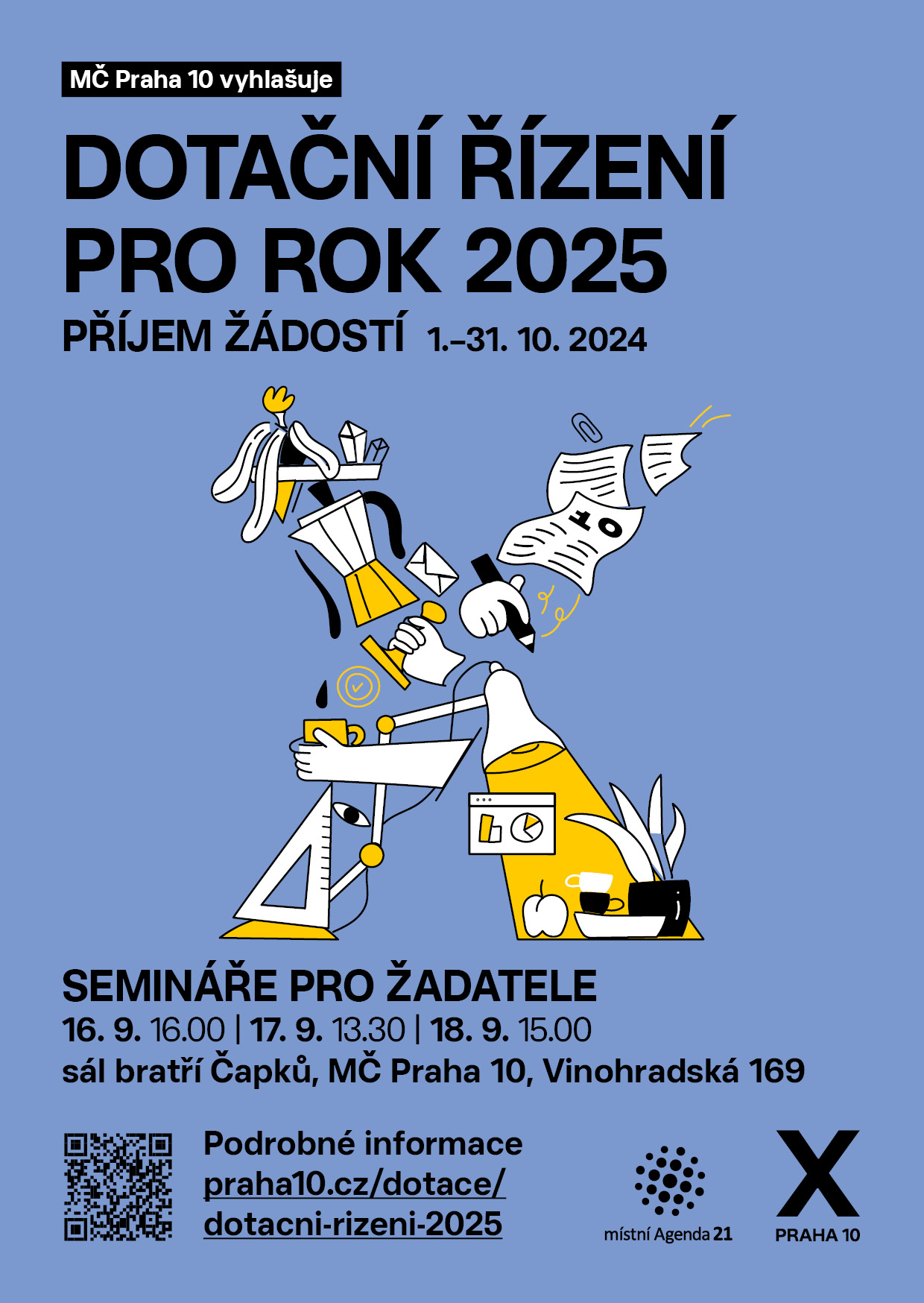 Ve dnech 16. až 18. září 2024 se uskuteční v zasedacím sále Bratří Čapků (MČ Praha 10, Vinohradská 169) informativní semináře k Dotačnímu řízení 2025. Příjem žádostí je od 1. do 31. října 2024.