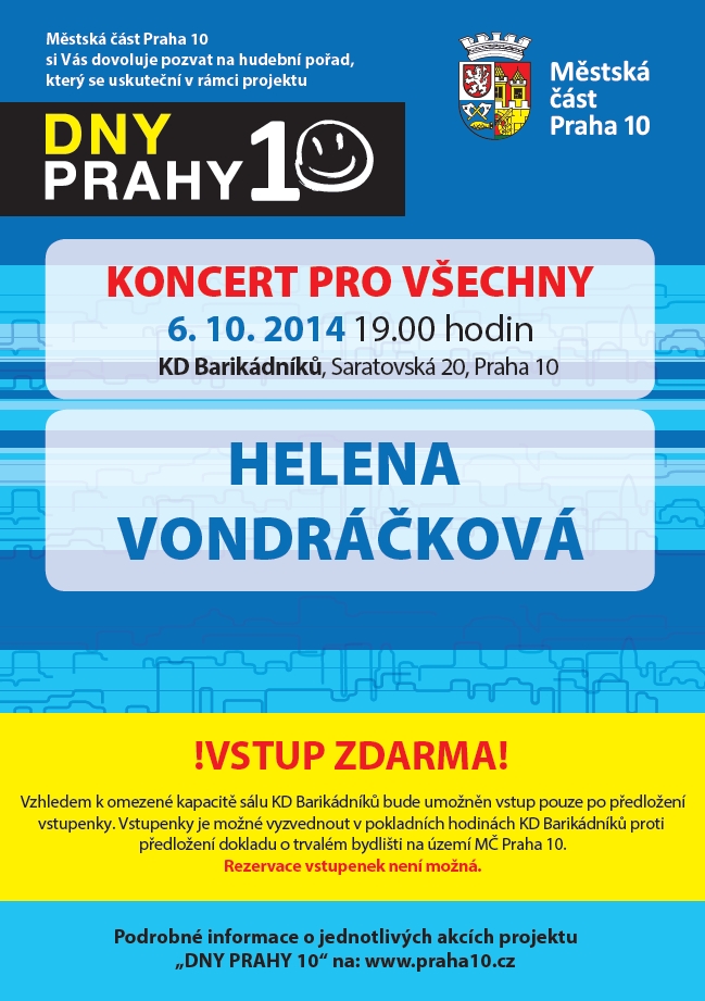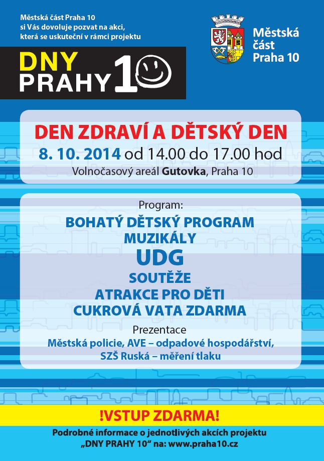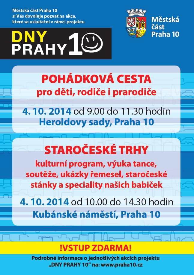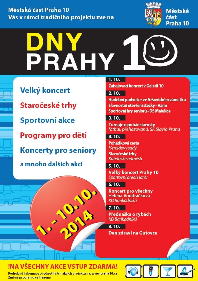 Městská část Praha 10 si vás dovoluje pozvat na kulturní, sportovní a společenské akce, které každoročně pořádáme v rámci tradičního projektu Dny Prahy 10. Program je připraven pro všechny věkové kategorie, například dětská pohádková cesta, turnaj ve fotbale a přehazované pro děti ZŠ, dále tradiční Staročeské trhy, koncert Heleny Vondráčkové, Velký koncert ve sportovním areálu Hamr, Den zdraví a dětský den se skupinou UDG, koncerty pro seniory a mnoho dalších.
