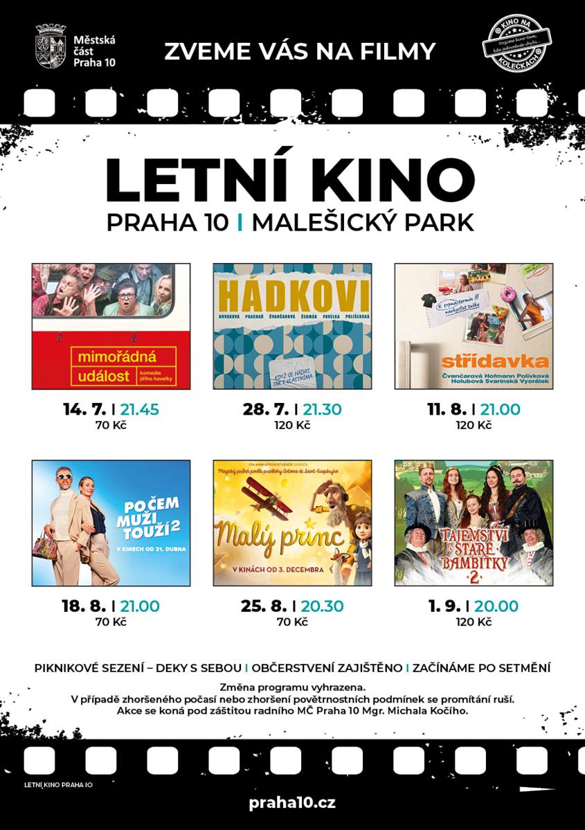 Desátá městská část, ve spolupráci s Kinem na kolečkách, se letos zaměřuje především na tuzemskou filmovou (a vesměs komediální) tvorbu. Nabídku doplňuje animovaná pohádka Malý princ na motivy stejnojmenného slavného díla Antoine de Saint-Exupéryho, která je na programu 25. srpna.