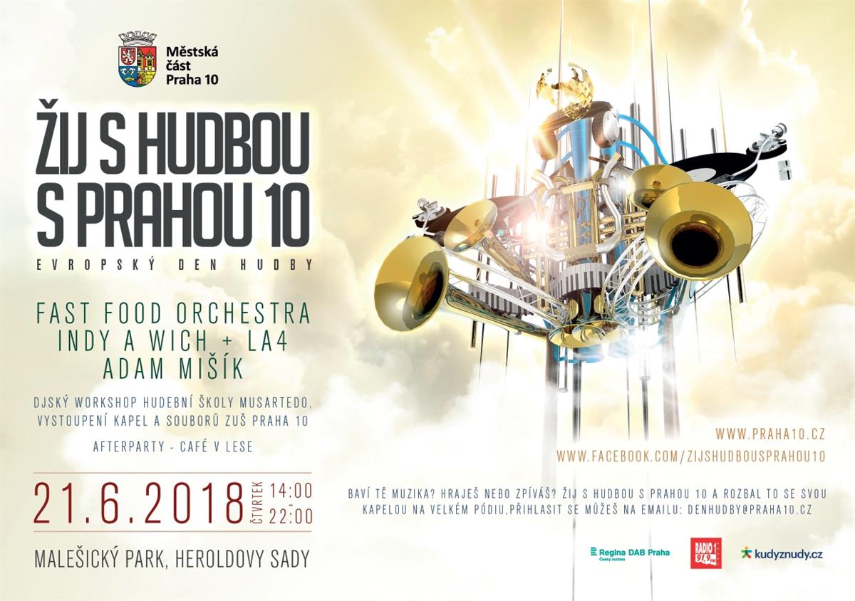 Hudba všech žánrů a pro všechny pod širým nebem – taková je hlavní myšlenka oslavy Evropského dne hudby, který proběhne ve čtvrtek 21. června 2018 na veřejných prostranstvích v Praze 10. Druhý ročník akce s názvem ŽIJ S HUDBOU S PRAHOU 10 promění park v Malešicích a Vršovicích na improvizované koncertní sály, kde na profesionálně vybavených podiích vystoupí například hiphopoví INDY&WICH, ska a reggae kapela FAST FOOD ORCHESTRA nebo zpěvák Adam Mišík.