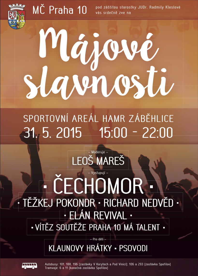 Program dlouho očekávaných Májových slavností naplánovaných na 31. května je zveřejněn. Ve sportovním areálu Hamr vystoupí coby hlavní lákadlo svitavsko-pražská skupina Čechomor, která se zaměřuje na české, moravské, slezské a slovenské lidové písně. Kromě Čechomoru se Pražané mohou těšit i na Těžkej Pokondr, kouzelníka Richarda Nedvěda, Elán revival a také Základní školu Švehlova, která vyhrála v letošním ročníku Praha 10 má talent. Májovými slavnostmi bude provázet moderátor Leoš Mareš.