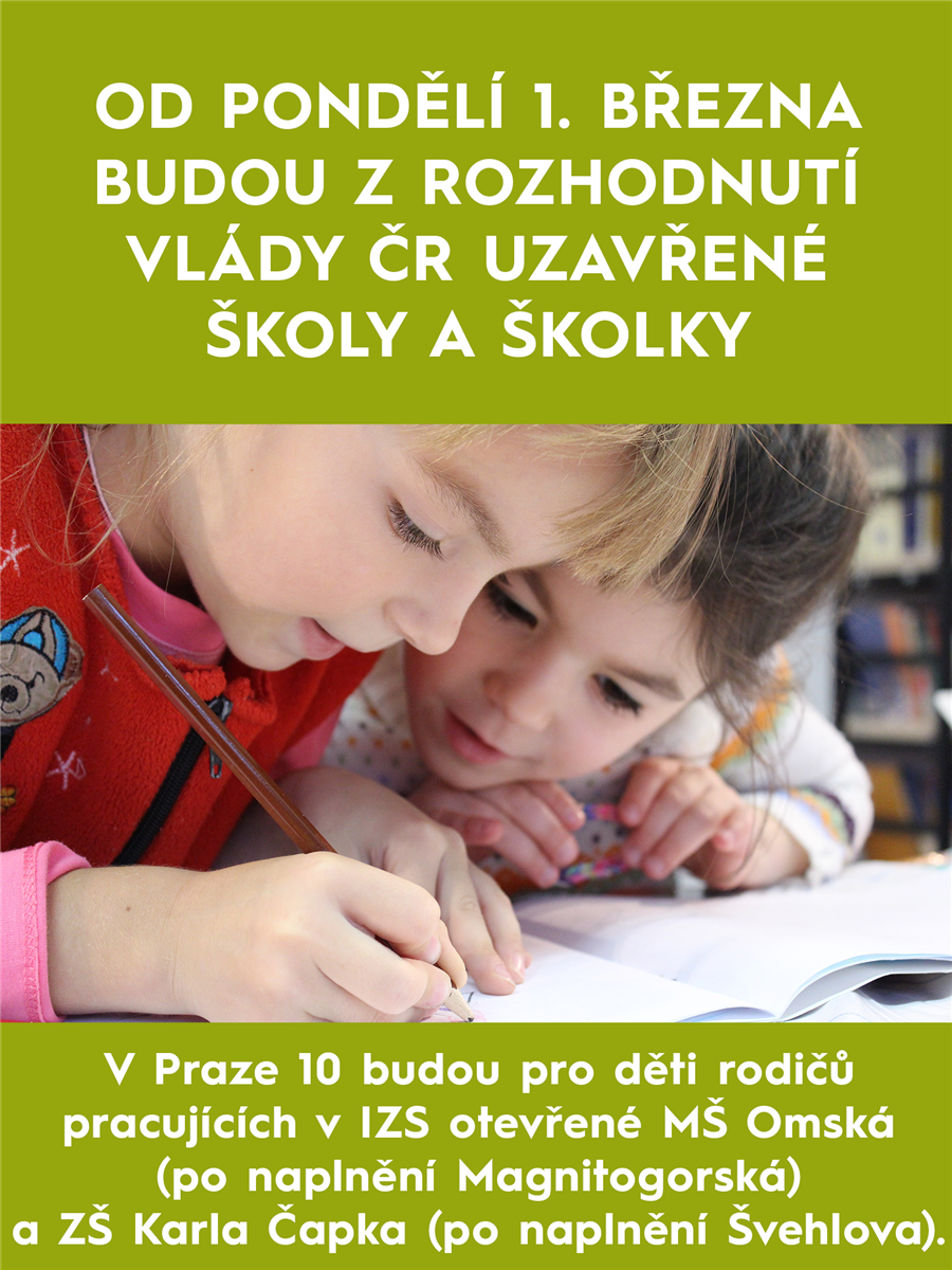 Z rozhodnutí Vlády ČR jsou nově uzavřené školy a školky. Vybraná zařízení však nadále fungují pro děti rodičů pracujících v „první linii“ – pracovníků bezpečnostních sborů, obecní policie, poskytovatelů zdravotních a sociálních služeb a některých dalších klíčových profesí. Pro ně budou na Desítce otevřené ZŠ Karla Čapka (v případě vyčerpání kapacit ZŠ Švehlova) a MŠ Omská (v případě vyčerpání kapacit MŠ Magnitogorská).