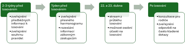 Jak losování proběhne: Losování bude probíhat za přítomnosti notáře a právníka, kteří budou dohlížet na dodržení pravidel a otevřenost procesu. Transparentnost zajistíme také prostřednictvím živého online přenosu a záznamu, který bude v souladu s platnými právními předpisy na ochranu osobních údajů a bude rodičům dostupný. Losování bude též přístupné veřejnosti, zejména zákonným zástupcům dětí.