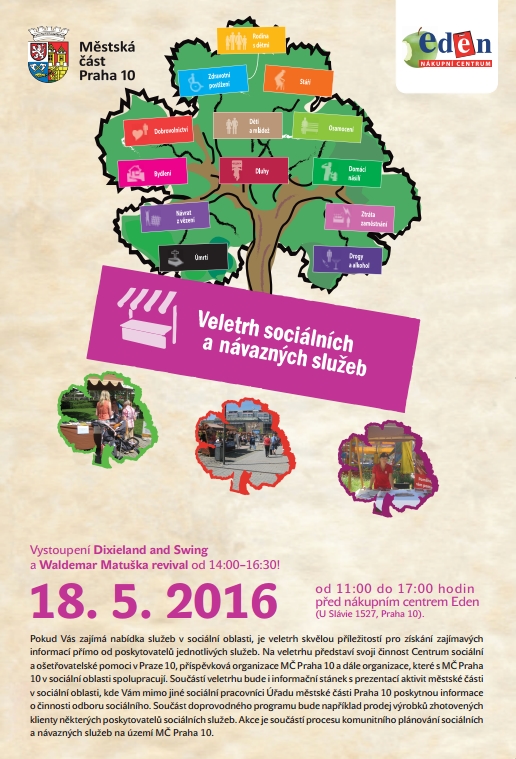 Dne 18. 5. 2016 od 11:00 do 17:00 hodin pořádá MČ Praha 10 již pátý ročník Veletrhu sociálních a návazných služeb před nákupním centrem Eden (U Slávie 1527, Praha 10).