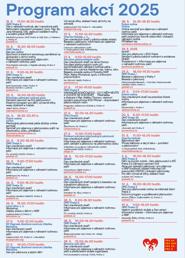 Další ročník osvětové akce zaměřené na náhradní rodinnou péči, Dny pěstounství, se v Praze uskuteční od 15. května do 19. června 2025. Pěstounská péče je formou náhradní rodinné péče, která by měla umožnit dětem, o které se nemohou jejich biologičtí rodiče postarat, vyrůstat v rodině a mít tak plnohodnotný život. Praha chce, stejně jako v předchozích letech, prostřednictvím Dnů pěstounství poděkovat těm, kteří pečují o potřebné děti, a těm, kteří uvažují zapojit se do náhradní rodinné péče, poskytnout motivaci a co nejvíce informací.