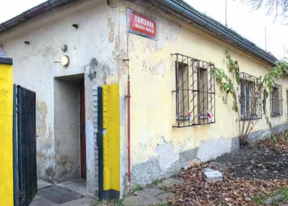 Podlouhlá přízemní budova působí omšele, kolemjdoucí by ji nejspíš minul bez povšimnutí. Ke vstupu ničím neláká a její nové využití signalizuje pouze nepatrná cedulka na okně. Když vejdete, pocítíte atmosféru osmdesátých let, kdy se nejspíš prováděly poslední rozsáhlejší úpravy interiérů včetně typického kachlíčkování veřejných sprch. Údajně zde také byly společné šatny a zázemí hospodářského dvora, nálepky na zadních dveřích zase dosvědčují zašlou slávu využití objektu pro potřeby autoškoly. Naše průvodkyně nicméně vypráví, že prostory převzali v překvapivě dobrém stavu, stačilo jen pořádně vygruntovat. Čisto tu opravdu je, teplo také a nechybí ani nefalšované nadšení těch, kteří se o všechno starají.