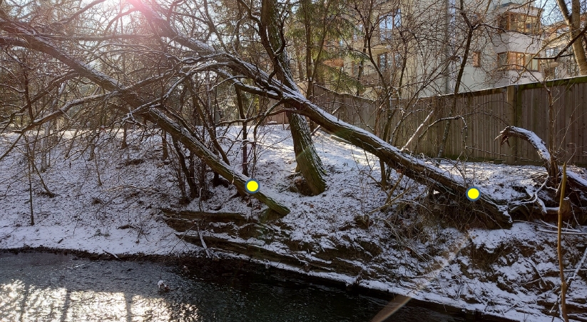 V případě stromů 8-9 se jedná o stromy vyrůstající z nábřežní zdi, kdy dochází k postupnému vytlačování tvárnic vlivem působení kořenového systému stromů a je tedy ohrožena stabilita koryta, vyústění stávající veřejné dešťové kanalizace DN 500 a navazujících pozemků.