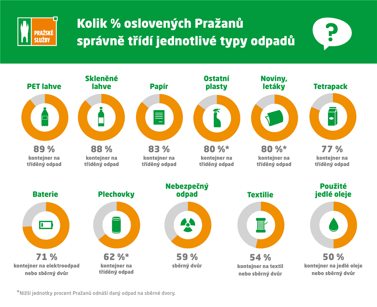 Pražané nejlépe třídí PET lahve, do žluté popelnice je nosí 89 procent lidí. Těsně za nimi jsou skleněné lahve a papír. Zhruba čtyři pětiny lidí správně třídí ostatní plasty, tiskoviny i tetrapaky. Lehce zaostává separace plechovek, které do šedých kontejnerů vyhazuje 62 procent obyvatel.