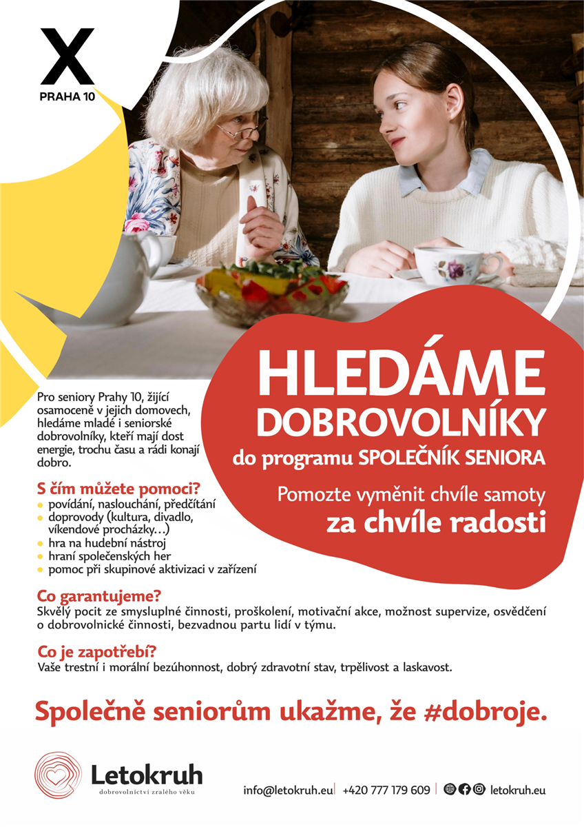 Víte, jak moc může znamenat obyčejná návštěva? Pro seniory, kteří žijí sami, může i krátké setkání přinést světlou chvíli do celého týdne. V organizaci Letokruh, kterou MČ Praha 10 podporuje, propojují lidi s chutí pomáhat s těmi, kdo už většinu života prožili, ale nemají kolem sebe blízké. A právě teď hledají nové dobrovolníky.