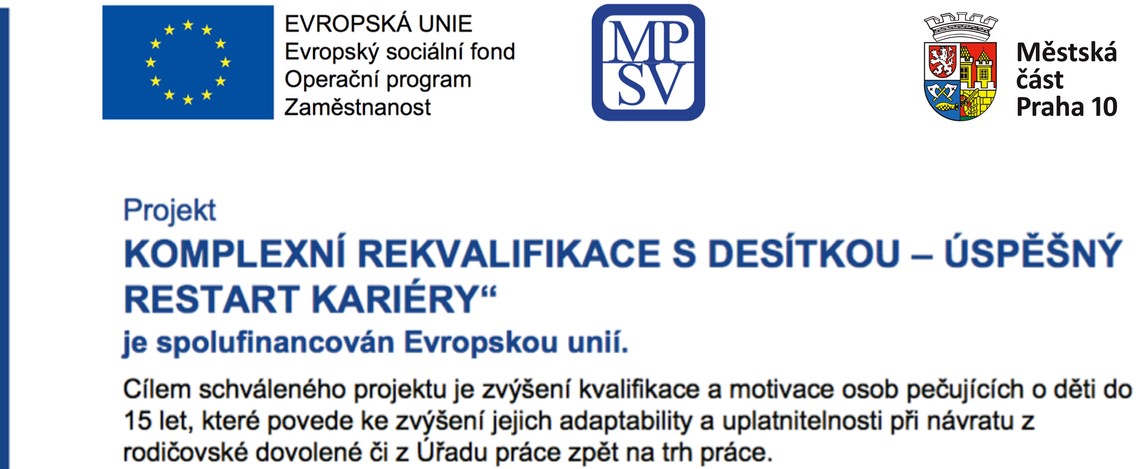 Městská část Praha 10 uspěla se svou projektovou žádostí v rámci vyhlášené 062. výzvy „Soutěžní projekty na podporu rovnosti žen a mužů v hl. městě Praze“ z Operačního programu Zaměstnanost, Prioritní osa: 1 Podpora zaměstnanosti a adaptability pracovní síly s projektem „Komplexní rekvalifikace s Desítkou – úspěšný restart kariéry“.