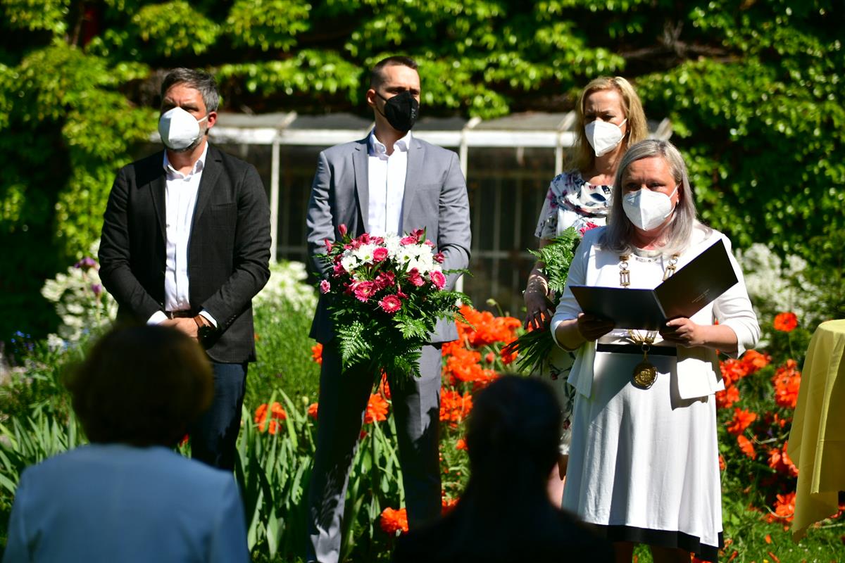 K samotnému předání došlo vinou pandemie a s ní spojených opatření až nyní: Pravnučky Čapkovy sestry Heleny převzaly z rukou starostky městské části Renaty Chmelové speciálně vyrobenou cenu ve tvaru desetistěnu. „Karel Čapek byl víc než spisovatel. Byl přirozenou veřejnou autoritou. Autoritou, která za svá slova ručila,“ řekla starostka Chmelová v úvodním proslovu. „Při zvažování čestného občanství se obvykle zvažuje dílčí přínos té které osobnosti. Její mimořádný přínos pro kulturu, věhlas naší metropole, případně hrdinství. Zde jsme na úrovni městské části. A jsme si jistí tím, že Karel Čapek splňuje naráz, najednou více měřítek a je nositelem více zásluh, než kolik tato ocenění předpokládají,“ dodala Renata Chmelová a připomněla nadčasovost jeho myšlenek, které jsou velmi aktuální i v současnosti.