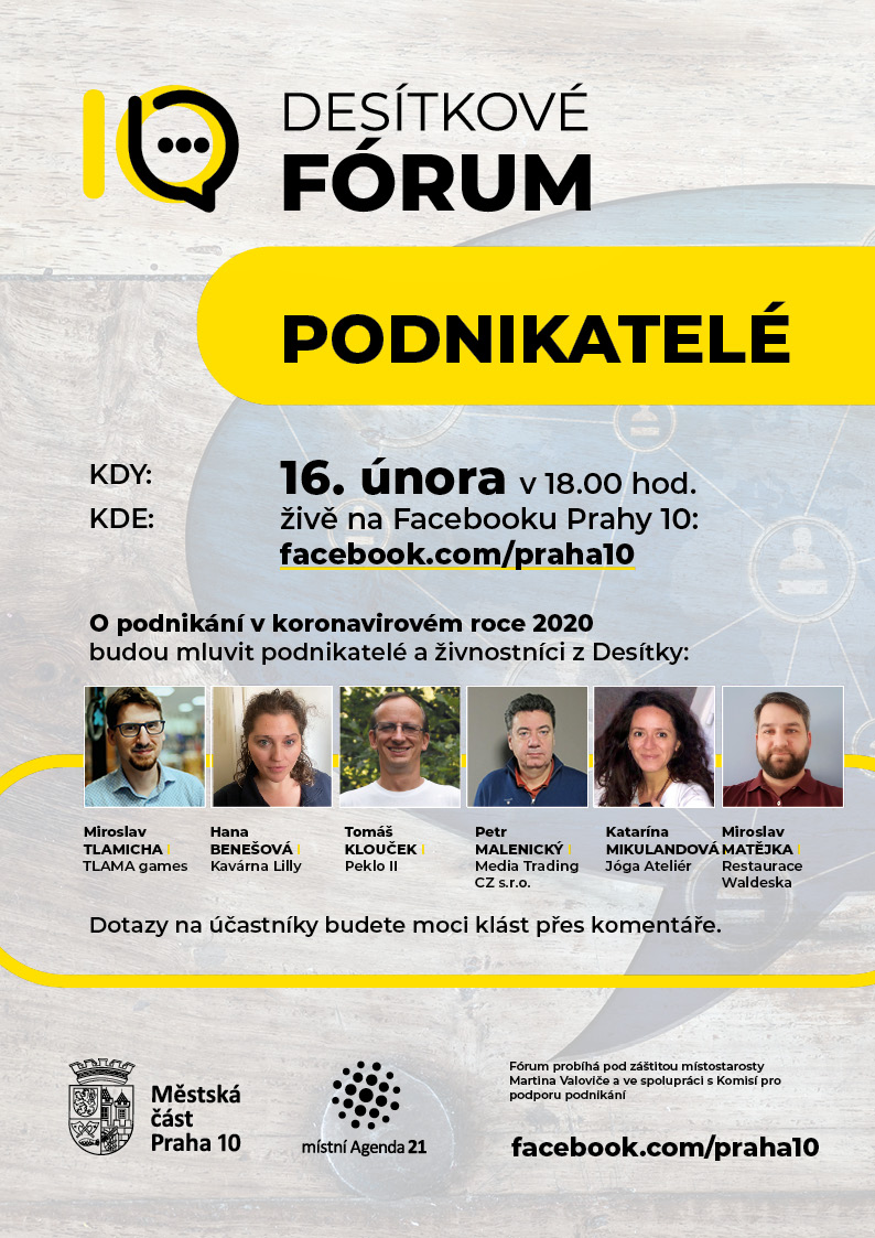 Na výzvu městské části reagovalo šest zájemců z rozličných podnikatelských oborů. Sledujícím Desítkového fóra se představí majitelé kavárny, restaurace, centra jógy a firem zaměřených na účetnictví, deskové hry a audiovizuální technologie. „Těší mě, že se nám splnil první cíl - přihlásilo se velmi pestré spektrum podnikatelů. Moderátorka Fóra ho bude vést tak, aby každý mohl zmínit inspirativní příklady ze své loňské praxe, a zároveň sdělit, jaké aktivity by uvítal jak od nás, tak od ostatních organizací veřejné správy,“ říká místostarosta Martin Valovič (ODS), jenž má na radnici v gesci mimo jiné podporu podnikání. Sama městská část považuje Fórum za první krok k rozvíjení spolupráce s podnikateli na svém území. „Městská část má samozřejmě omezené kompetence, v některých případech ale můžeme živnostníkům velmi efektivně pomoci. Kromě adresného předávání důležitých informací to je zejména podpora networkingu a propagace zajímavých služeb, které jsou na Desítce k dispozici. To jsou tři základní pilíře, na kterých by měla naše úzká spolupráce stát,“ popisuje místostarosta Valovič. Ten chce, společně s komisí pro podporu podnikání, například pořádat pravidelné podnikatelské snídaně. „S touto aktivitou bychom rádi začali hned, jakmile to epidemická situace dovolí. Sám z podnikatelské praxe vím, že na úřadě člověk nejčastěji vyřizuje neoblíbené administrativní záležitosti, a touto optikou ho i vnímá. Chceme ukázat, že radnice může i pomáhat,“ prohlašuje Martin Valovič. Na pilotní diskuzi s podnikateli naváže desátá městská část Fóry pro další cílové skupiny, konat se budou přibližně ve čtvrtletní periodicitě. Podrobnější informace k Fóru pro podnikatele najdete na FB.